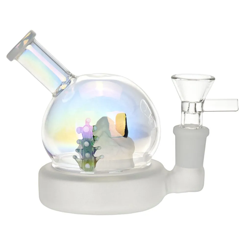 Bring holiday cheer to your sessions with the Christmas House Globe Mini Bong! Standing at 3.75 inches, this unique glass water pipe is shaped like a snow globe and features a charming Christmas house percolator inside. Made from durable borosilicate glass, it includes an angled mouthpiece and a 14mm male herb slide with a handle for easy use. Perfect as a festive addition to your collection or as a holiday gift!